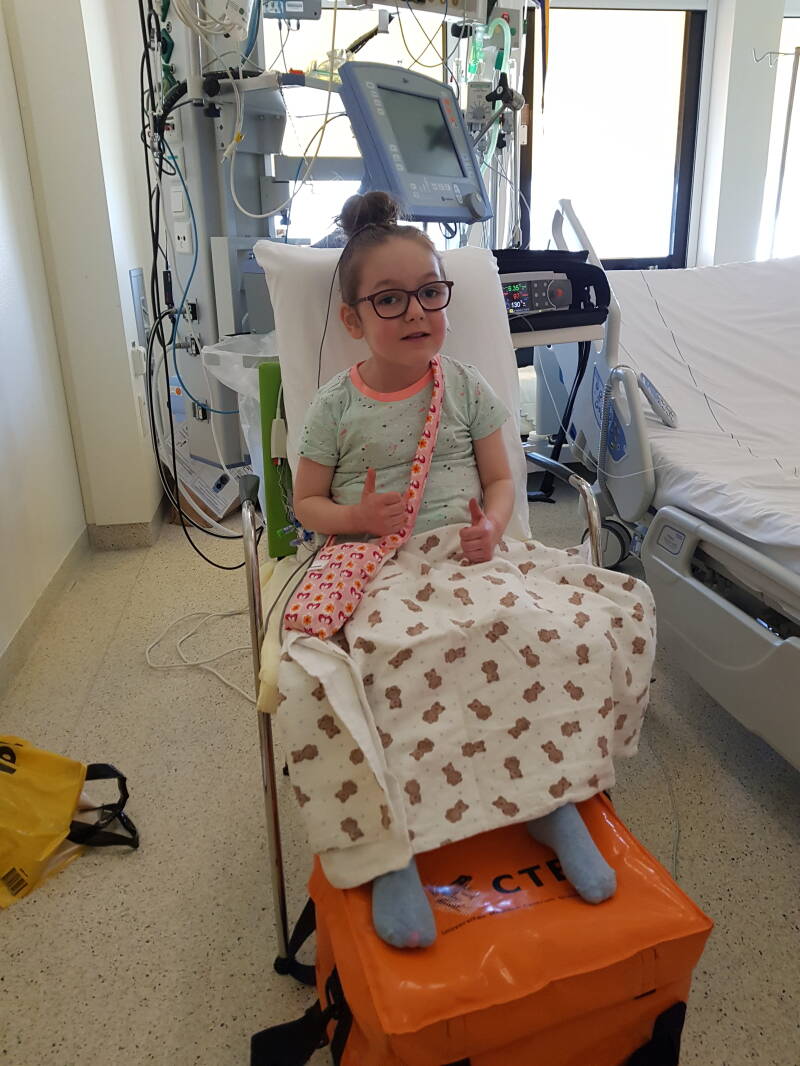 Op de foto kun je zien dat Nienke haar kastje in een schoudertasje bij zich draagt. Daar zit een mooi verhaal aan vast. Een week voor de geplande operatie belde HvdA(verpleegkundig specialist) ons via videobellen. Nienke was toen in het WKZ en had allerlei vragen voorbereid over haar opname. Tijdens het gesprek werden al haar vragen zo goed als mogelijk door hem beantwoord en ook vertelde hij dat hij een vriendin had die erg goed met de naaimachine overweg kon. Zij zou tasjes maken voor Nienke. Er zijn namelijk geen tasjes te krijgen voor de pacer maar ze heeft er zeker een nodig. Op het moment dat hij dit vertelde aan Nienke was ik zo ontroerd. Het liet mij zien dat Groningen Nienke als persoon, als meisje van 5 ziet. Ze is geen experiment, geen interessant geval maar een meisje die zij graag willen helpen. Dit raakte mij in mijn moederhart. Uiteraard zijn zij ook geïnteresseerd vanuit hun vakgebied maar de persoonlijke aandacht stond tijdens het gesprek centraal en daar ontbreekt het tijdens deze opname zeker niet aan. Op de labels van de tasjes (ze heeft er twee) staat 'Oma Baukje'. Ik ken Oma Baukje niet en Oma Baukje kent ons niet maar: Oma Baukje, mocht je dit ooit lezen, heel erg bedankt voor de prachtige tasjes voor Nienke. Ze is er heel wijs mee en gaat ze zeker vaak gebruiken.