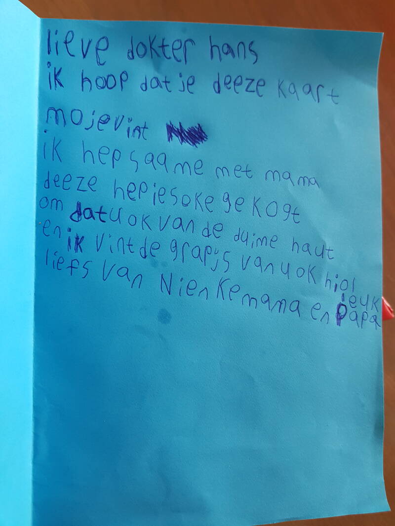 Wat een mooie lieve kaart van Nienke en wat een ontroerende foto met de knielende dokter. Zou fijn zijn, Geraldine, als je weer wat meer ruimte voor jezelf en je zonen gaat krijgen. Take care.