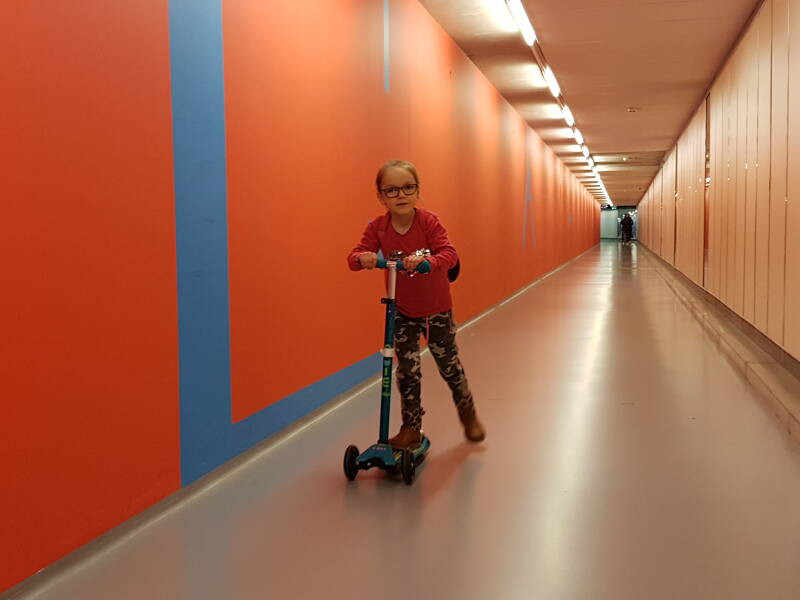 Nienke verveelt zich vooralsnog niet in het ziekenhuis maar verlangt er erg naar om weer naar huis te gaan. In overleg met haar team is besloten dat zij morgen en zondag overdag een paar uurtjes naar huis mag. In het verleden hebben wij altijd gezien dat dat een enorm positief effect heeft op het herstellen van Nienke. Zo gauw zij thuis is beweegt zij meer en hoe meer zij beweegt hoe lekkerder en vooral blijer zij zich voelt. Ik hoop dat dit weekend weer datzelfde effect zal hebben. Omdat bewegen haar zo goed doet en mij natuurlijk ook gaan wij elke ochtend op pad. Nienke heeft een step van thuis meegenomen en daarmee gaat zij crossend door de gangen. Elke dag gaan wij ook naar de kelderverdieping en nemen wij de lange ondergrondse gang naar UMC. Dit is voor Nienke een flinke rit en doet ons beiden goed.