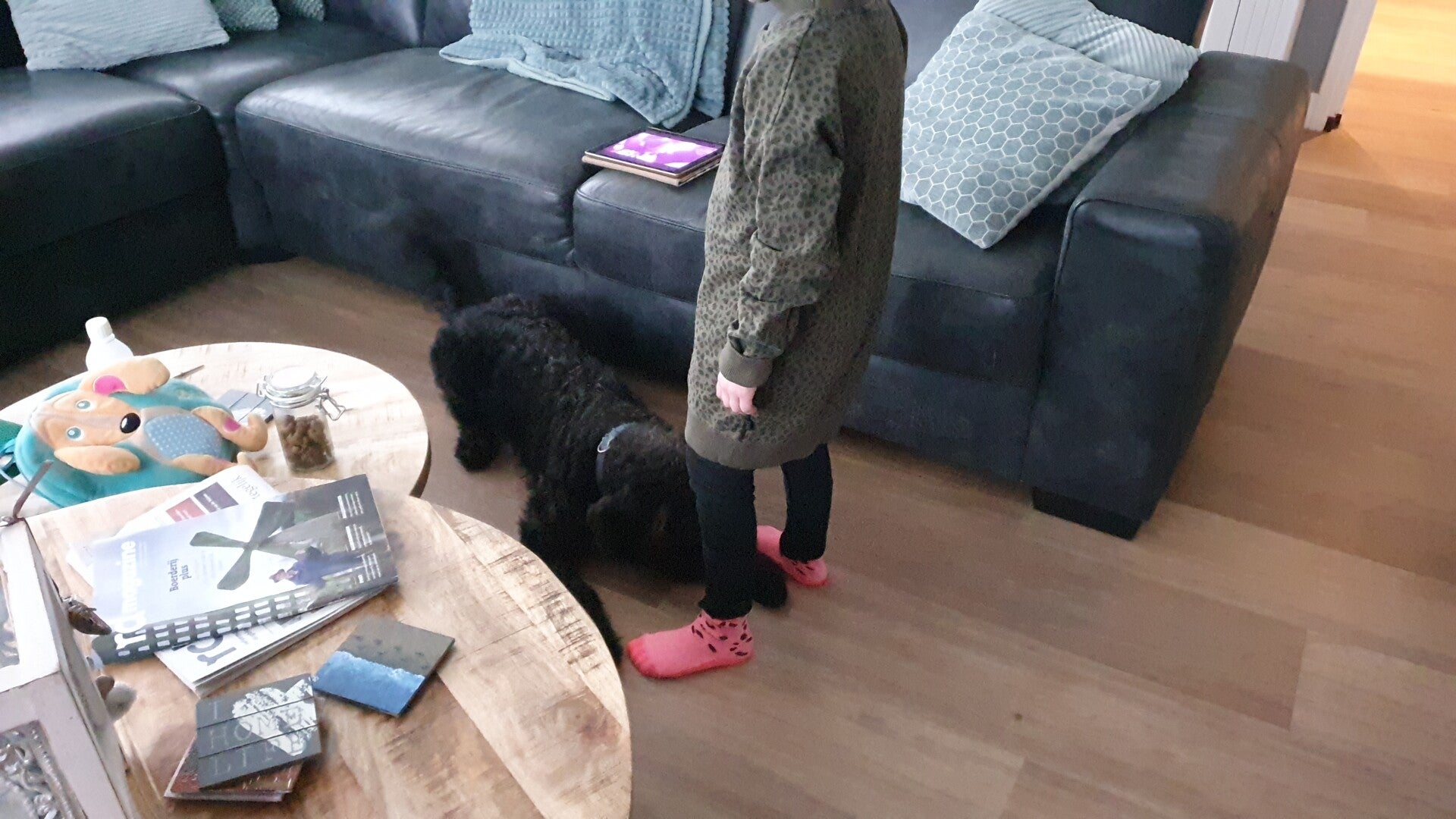 Wat betreft het Nienke-Teddy Team. Dat gaat erg goed. Teddy wil niks liever dan werken voor ons. Al het werkt zit verpakt in spel-vorm dus zo gauw hij merkt dat wij iets van hem verwachten word t het een brok energie. Hij krijgt een hyper-focus en zou uren door willen gaan. Echt een top-karakter voor een hulphond. Onze Noushka is een golden retriever die erg houdt van gezelschap maar als zij ligt te slapen/luieren dan moet je wel met iets heel lekkers aankomen wil je haar in beweging krijgen. Teddy is het tegenovergestelde. Als ik al op een bepaalde manier ga zitten staat hij in de startblokken. Ik vind het fantastich hoe onze trainer Mieke van stichting KIBO door zijn hypere puppy karakter heen heeft kunnen kijken en dit er een half jaar geleden al in kon ontdekken.